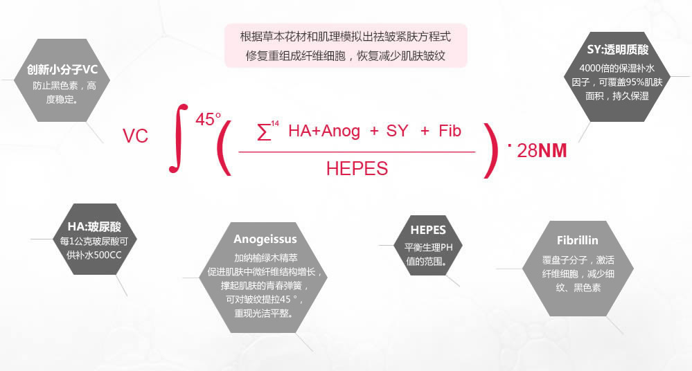 創(chuàng)新納米活力VC,滲透發(fā)揮功效,提高纖維細(xì)胞功能,還原肌膚內(nèi)部成纖維活性動(dòng)力。